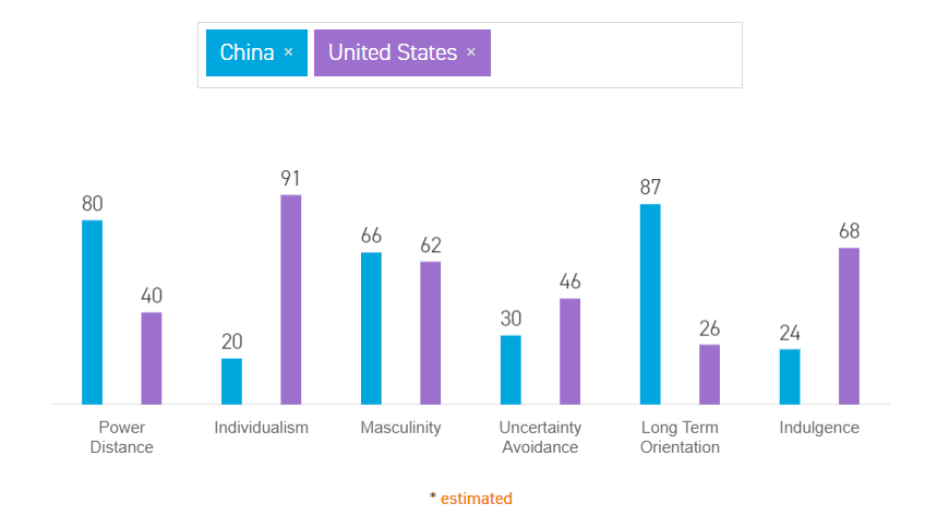 When typing in China and the United States in the Country Comparison Tool on Hofstede Insights, the result will come like this: