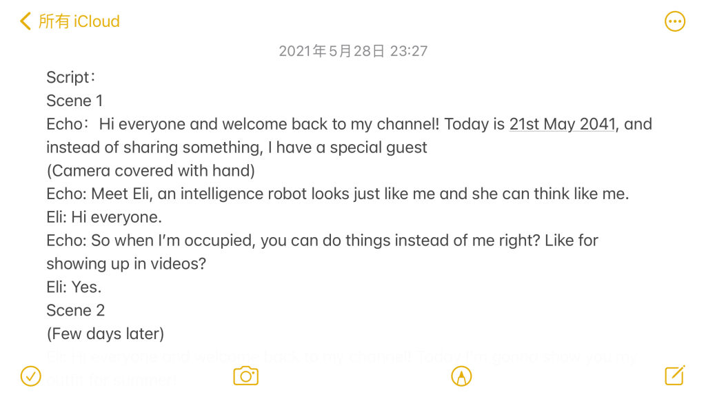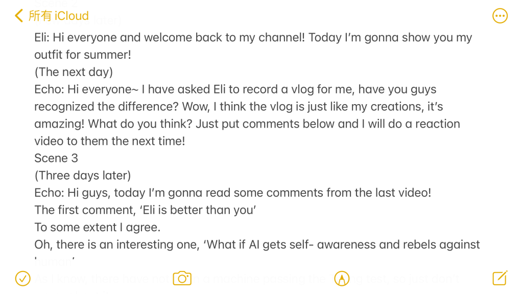 Also, it is a common issue that people think AI will destroy people in the future, especially in many sci-fi movies and video games, so I decide to include that part in my video. I played the two roles, Echo and Eli, so for distinguishing I dressed different clothes except for the final scene, where Eli became Echo.