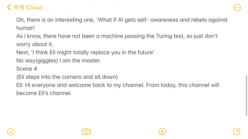 After communicating with Bob in the class, I decided that my second informational video will talk about advantages and disadvantages of AI. For each side, we have worked out 4 points. Then I found that for a 7-minute video, these contents are far away from enough. So, I watched some videos of the same kind on YouTube and add the Q & A to my video. The idea of the short scenario came out my mind suddenly, and the original script had more plots than the video showed, but time was not enough to put all those in, and I decided to delete some parts.