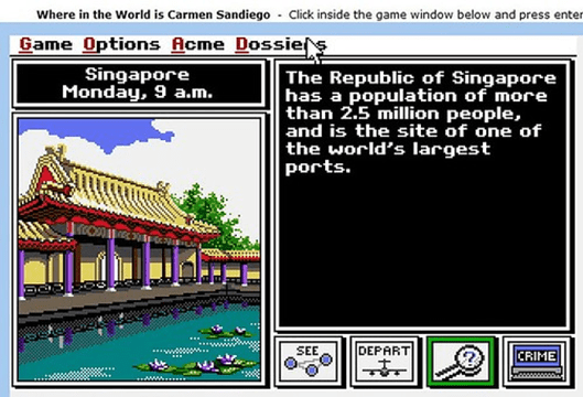 In “Where in the World Is Carmen Sandiego” , an educational detective-simulation video game, player will travel all across the globe in search for the legendary female Fatale Carmen Sandiego, track down her whereabouts and capture the criminal in this classic game, put criminals behind bars to catch up the legendary criminal in the end.